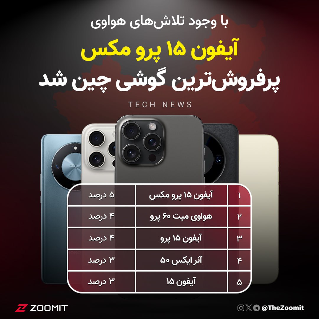 🔴 با توجه به اطلاعات کانترپوینت ریسرچ، آیفون ۱۵ پرو مکس، ۵ درصد از بازار چین رو در اختیار داره و پرفروشترین مدل در منطقه خودش شده و مدل پرچمدار گوشی هواوی با ۴ درصد سهم بازار، در جایگاه دوم قرار گرفته؛ سه گوشی از پنج تلفن هوشمند پرفروش چین رو محصولات اپل شامل میشن